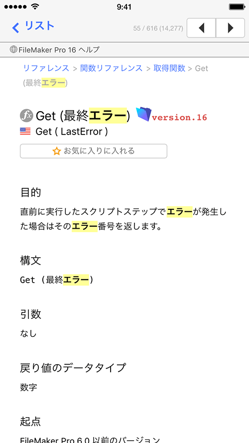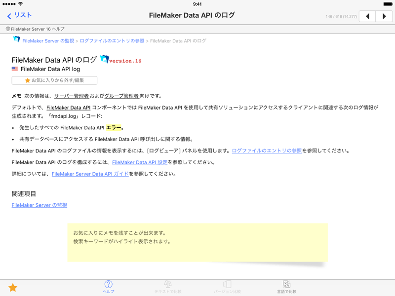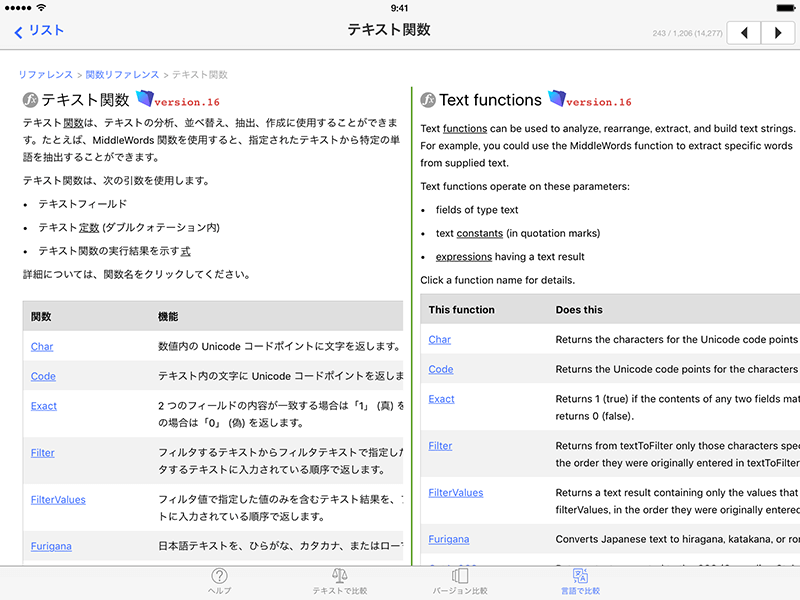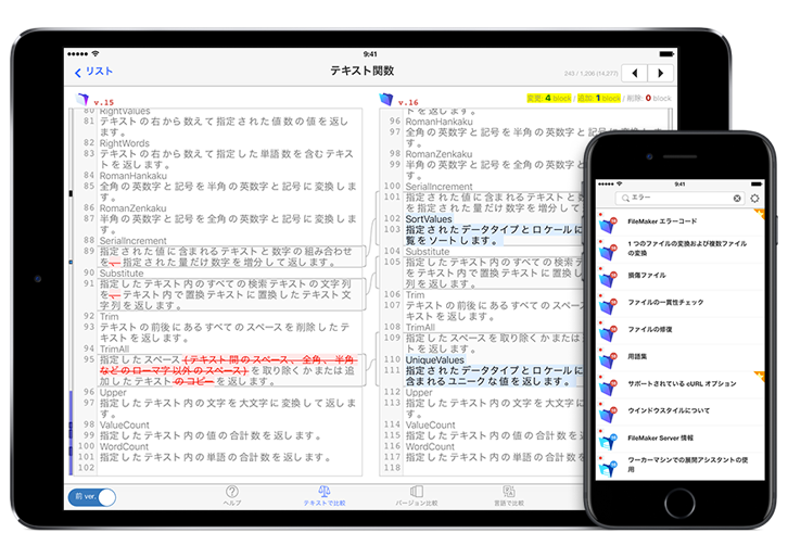 バージョン間の変更点の把握や ヘルプの検索にかける時間を大幅に軽減できます。 - iOS デバイス上でいつでも、FileMaker の複数バージョンのヘルプを利用でき、FileMaker 製品を使用するすべてのユーザにとって(一般利用者 / 開発者ともに)便利な機能を備えております。