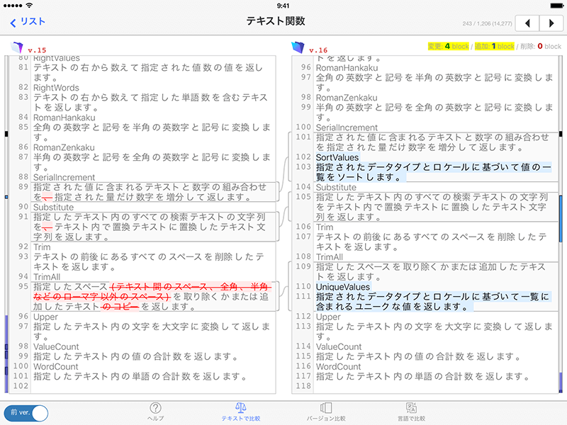 前後のバージョンの比較表示(iPad 版のみ)