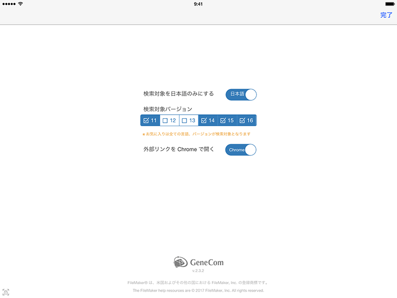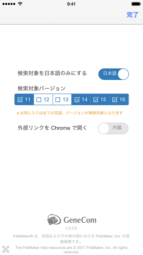- 検索対象バージョン: FileMaker 製品 Ver.11〜Ver.16 まで任意に選択可能